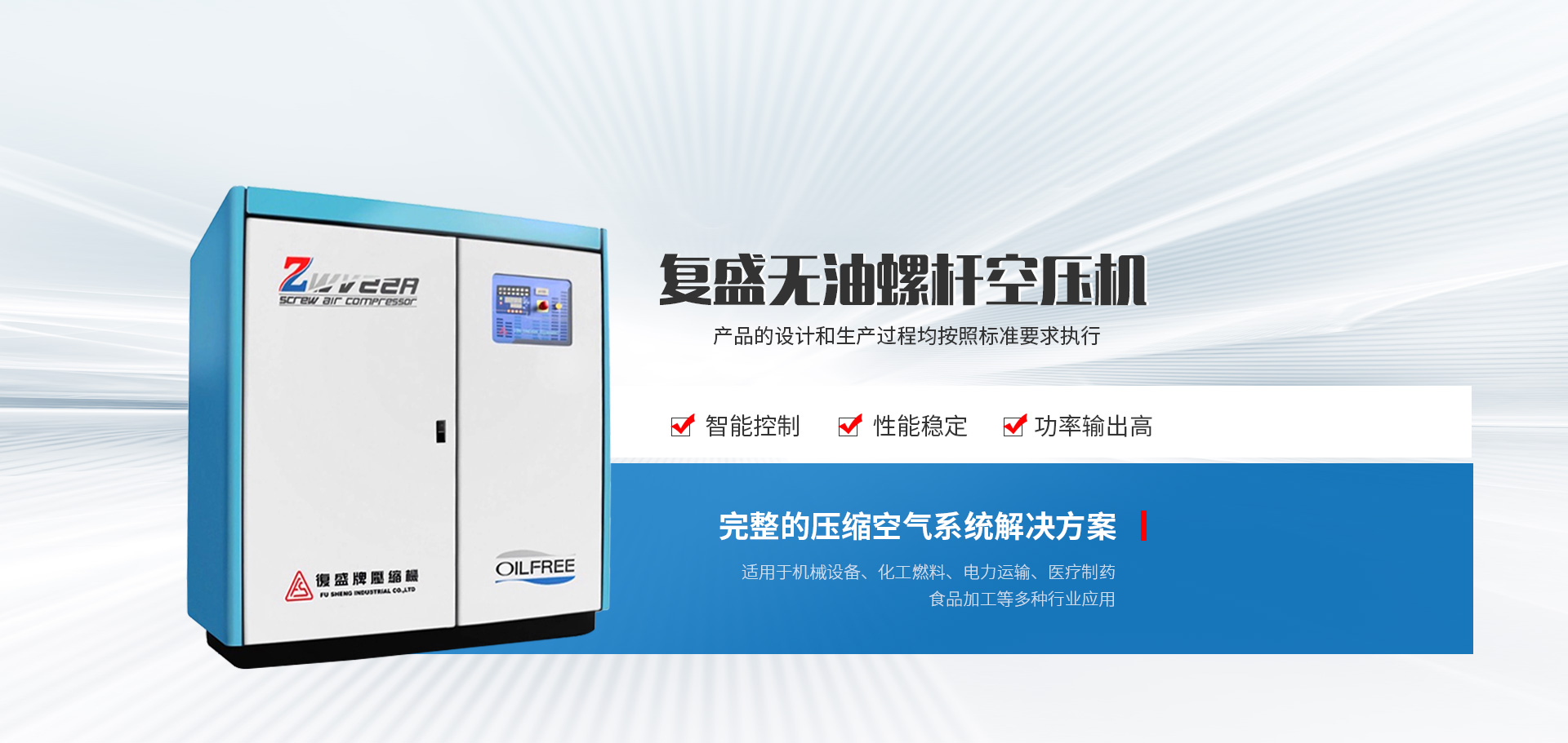 复盛螺杆式空气压缩机由微电脑控制,具有自我诊断保护,明确指示及控制空压机的运转,停车等功能,可24小时连续工作,无须专人看护